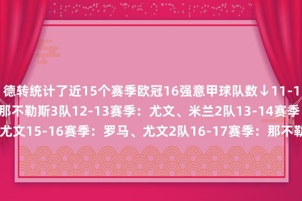 德转统计了近15个赛季欧冠16强意甲球队数↓ 11-12赛季:国米、米兰、那不勒斯3队 12-13赛季:尤文、米兰2队 13-14赛季:米兰 14-15赛季:尤文 15-16赛季:罗马、尤文2队 16-17赛季:那不勒斯、尤文2队 17-18赛季:罗马、尤文2队 18-19赛季:罗马、尤文2队 19-20赛季:尤文、那不勒斯、亚特兰大3队 20-21赛季:尤文、亚特兰大、拉都奥
