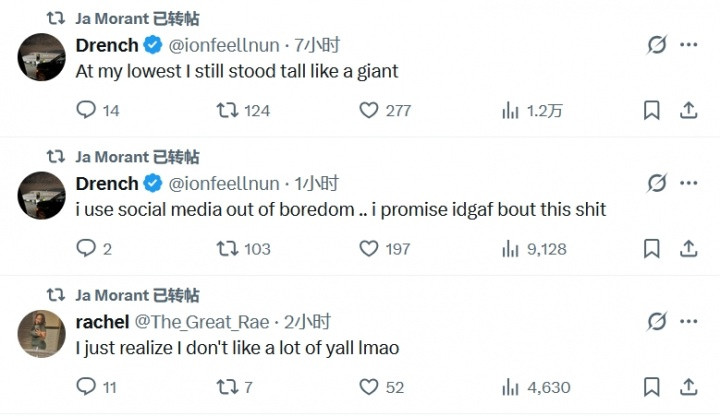 莫兰特当天随后转发多条推特,交替是: