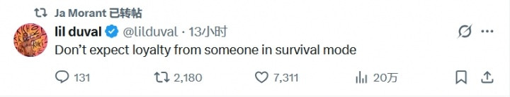 直播吧01月10日讯据Shams此前报说念,灰熊初度探究将莫兰特摆上货架。 莫兰特当天随后转发多条推特,交替是: “不要指望处于生计情势的东说念主会诚心于你。” “即使在我最陡立的期间,我还是像巨东说念主相通挺拔屹立。” “我用酬酢媒体随便是因为败兴......我发誓我根蒂不在乎这些破事。” “我已而意志到我不可爱你们许多东说念主体育赛事直播,哈哈哈哈。”