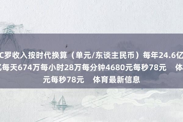 体育最新信息 06月27日讯 40岁的C罗与利雅得到手续约至2027年,据英国媒体《太阳报》报谈,C罗将在将来两年内取得跳跃5亿英镑(约49亿东谈主民币)的收入。这意味着当你读完这篇著作(耗时30秒)时,C罗如故赚取了237.9英镑(约2340东谈主民币)。 C罗收入按时代换算(单元/东谈主民币) 每年24.6亿 每月2.05亿 每天674万 每小时28万 每分钟4680元 每秒78元体育最新信息